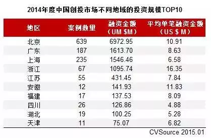 (2014年度中国创业投资地区分布TOP10。投中集团数据)