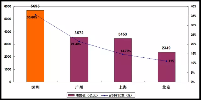 2014年深圳科技型企业超过3万家,经认定的国家高新技术企业4742家;生物、互联网、新能源、新一代信息技术、新材料、文化创意等六大战略性新兴产业近五年以年均20%以上的速度增长,增加值达到5695亿元,占GDP的35.6%。