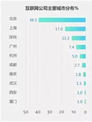 从绝对数量考虑,北京是中国互联网产业的硅谷。2014年,北京在互联网公司主要城市分布中的占比为39.3%;年营收总额超过2.4亿元的中国互联网百强中,地处北京的企业有48家、上海18家、广东15家,三地入围企业数量占比超过80%,营收总和近650亿元。
